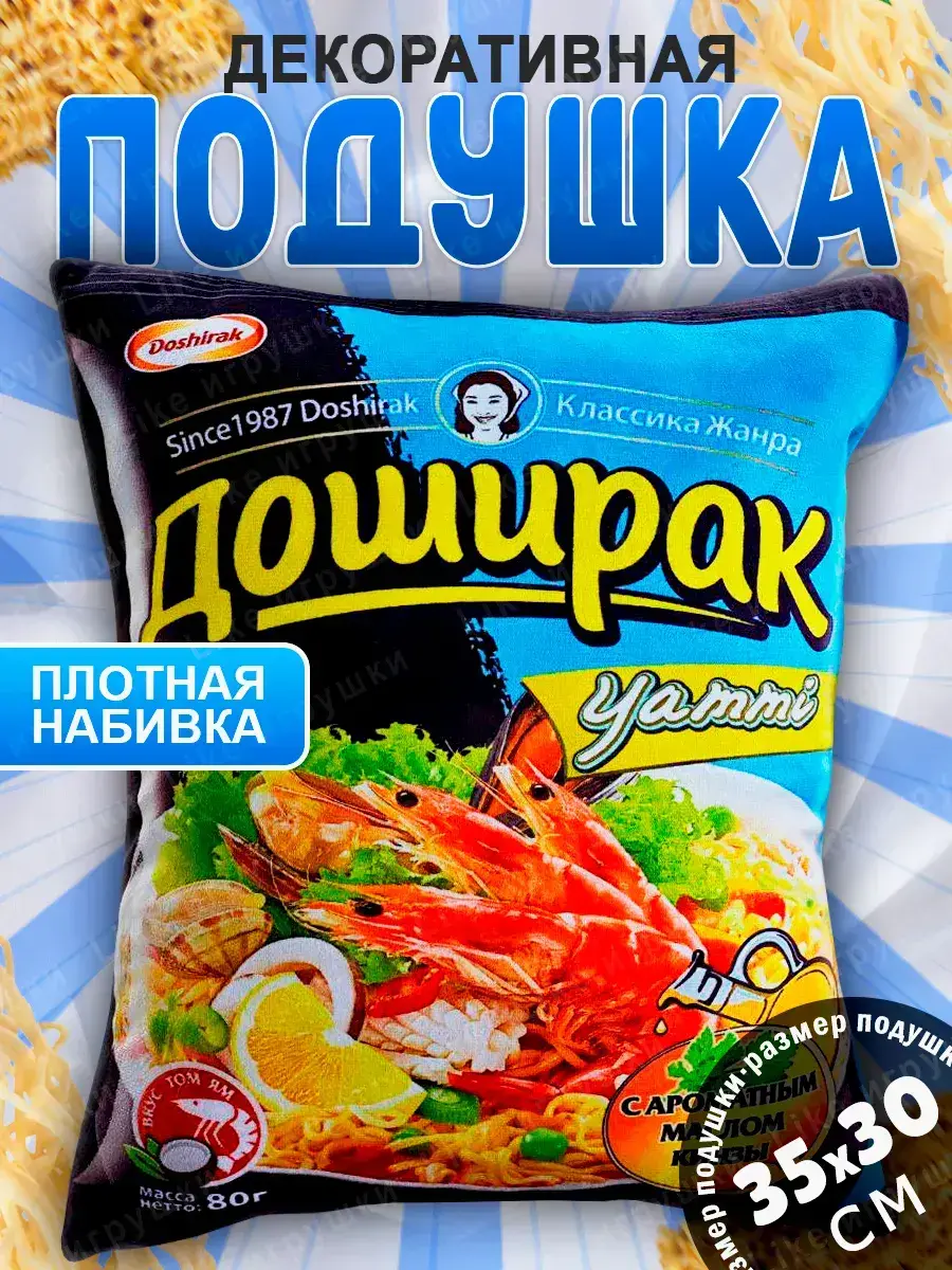 Прямоугольная подушка в виде корейской лапши быстрого приготовления Доширак – это не просто предмет интерьера, это функциональный элемент вашего пространства. Ее можно использовать как уютную обнимашку или же просто как часть декора вашей комнаты. Уникальный дизайн обязательно привлечет внимание гостей.
