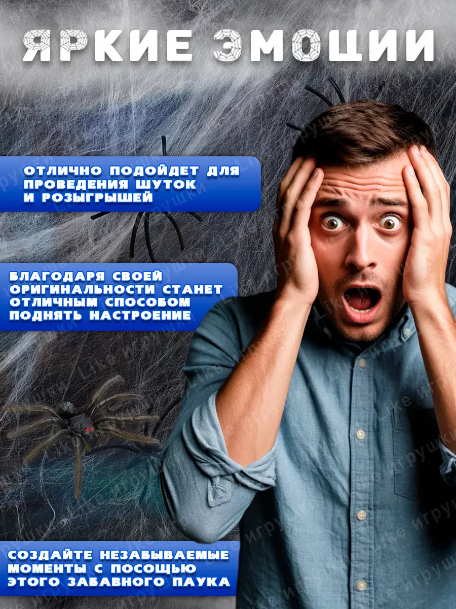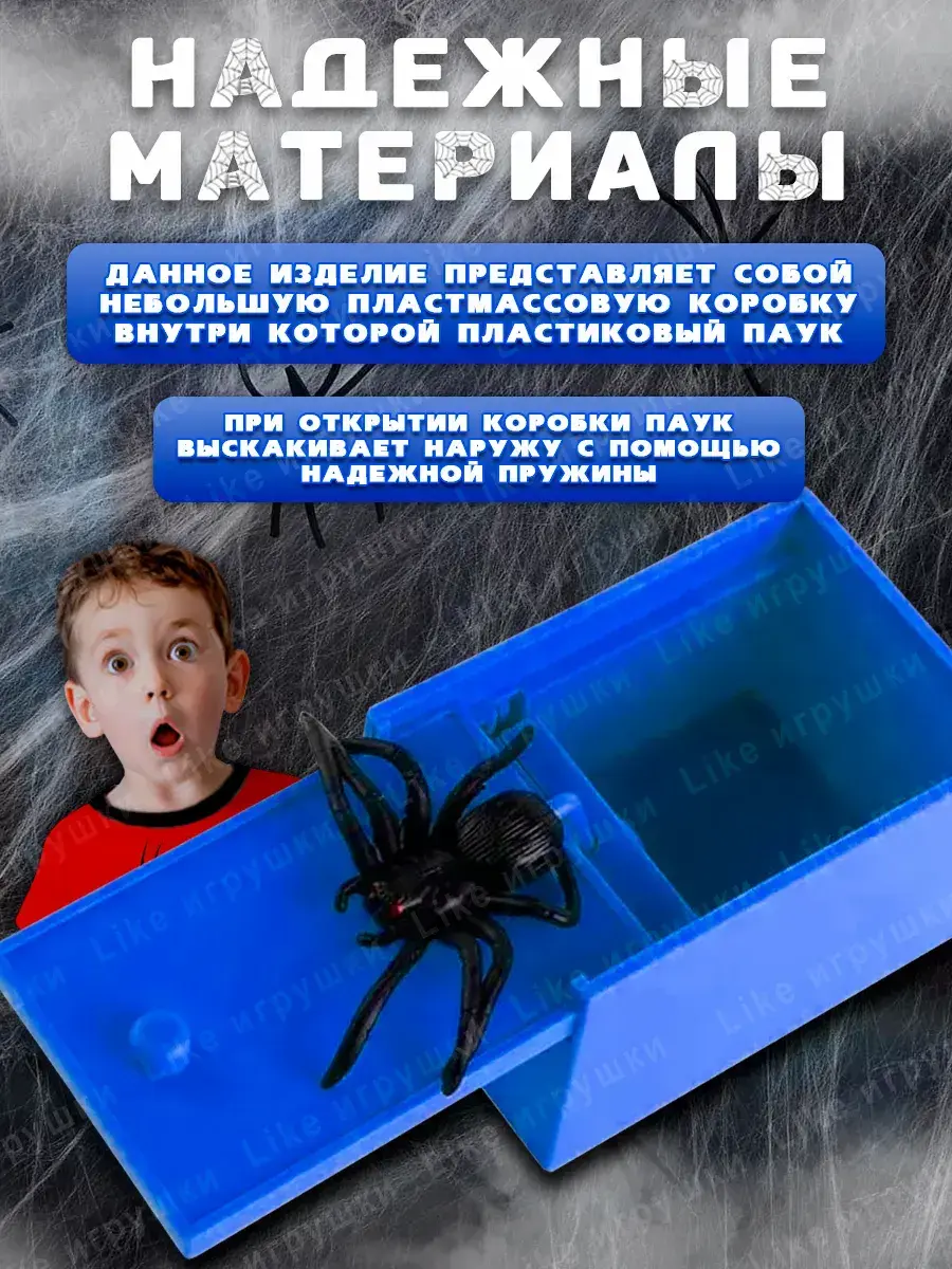 Паук изготовлен из мягкого материала, поэтому безопасен даже при самой быстрой реакции на встречу с ним. Так что можете быть уверены: все закончится только смехом! Паук выглядит так, будто он настоящий, что усиливает эффект неожиданности. Прочная деревянная коробка и долговечная фигурка паука обеспечат множество повторных розыгрышей. Легкость использования: просто откройте крышку и наблюдайте за реакцией жертвы!