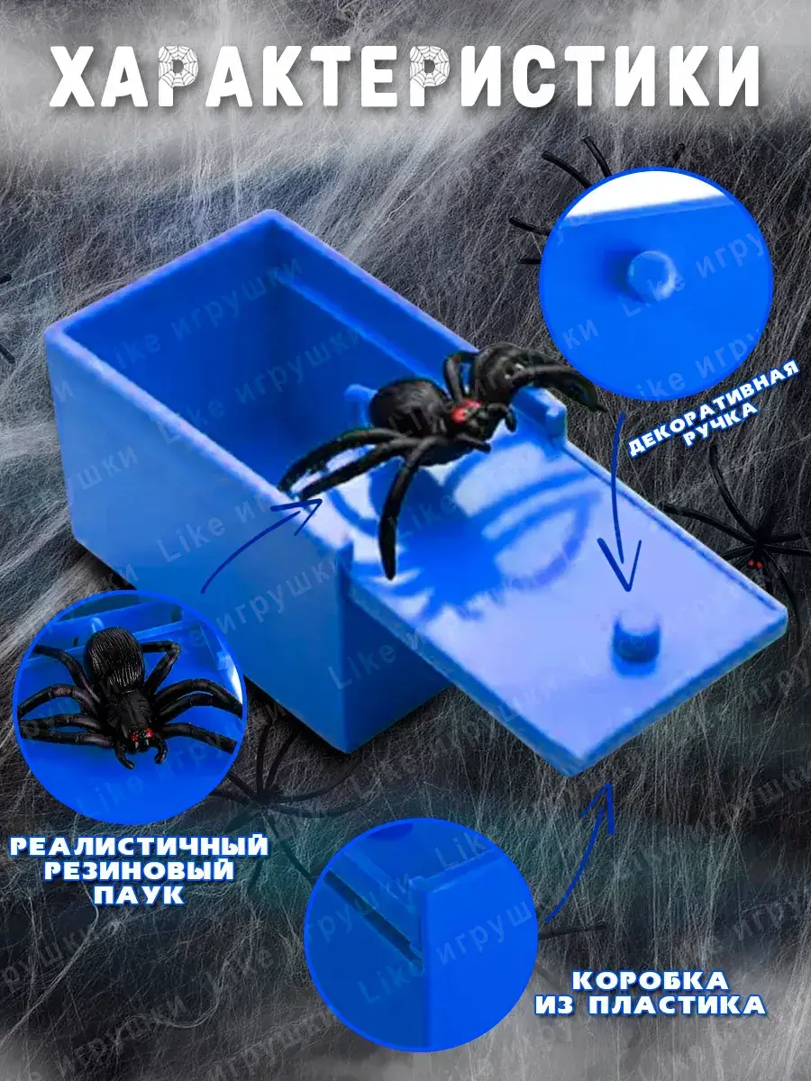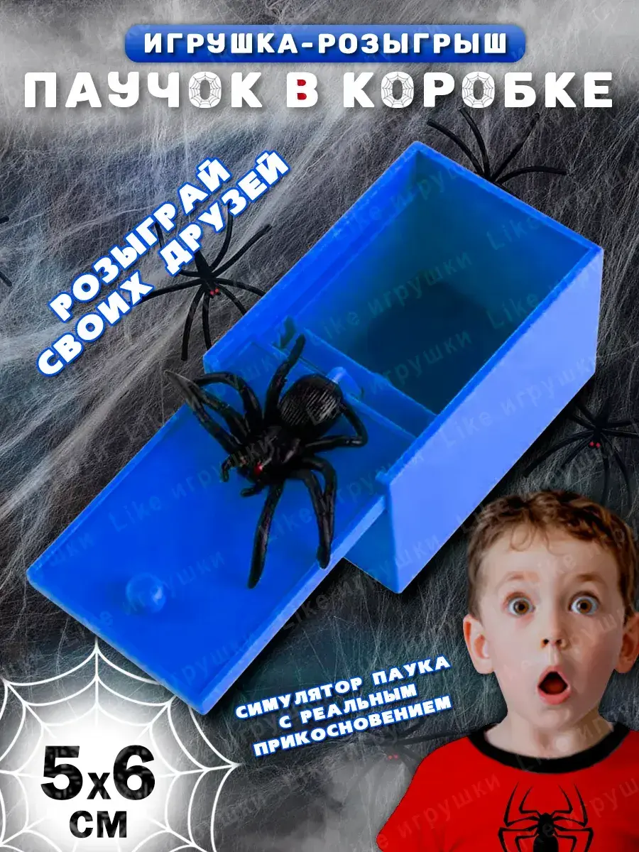 Игрушечный паук в коробке — это то самое что-то прикольное, чего так не хватает в серые будни. Чудесный способ разнообразить обычный день своими собственными пранками и розыгрышами. Незаменимая штуковина для всевозможных шуток.