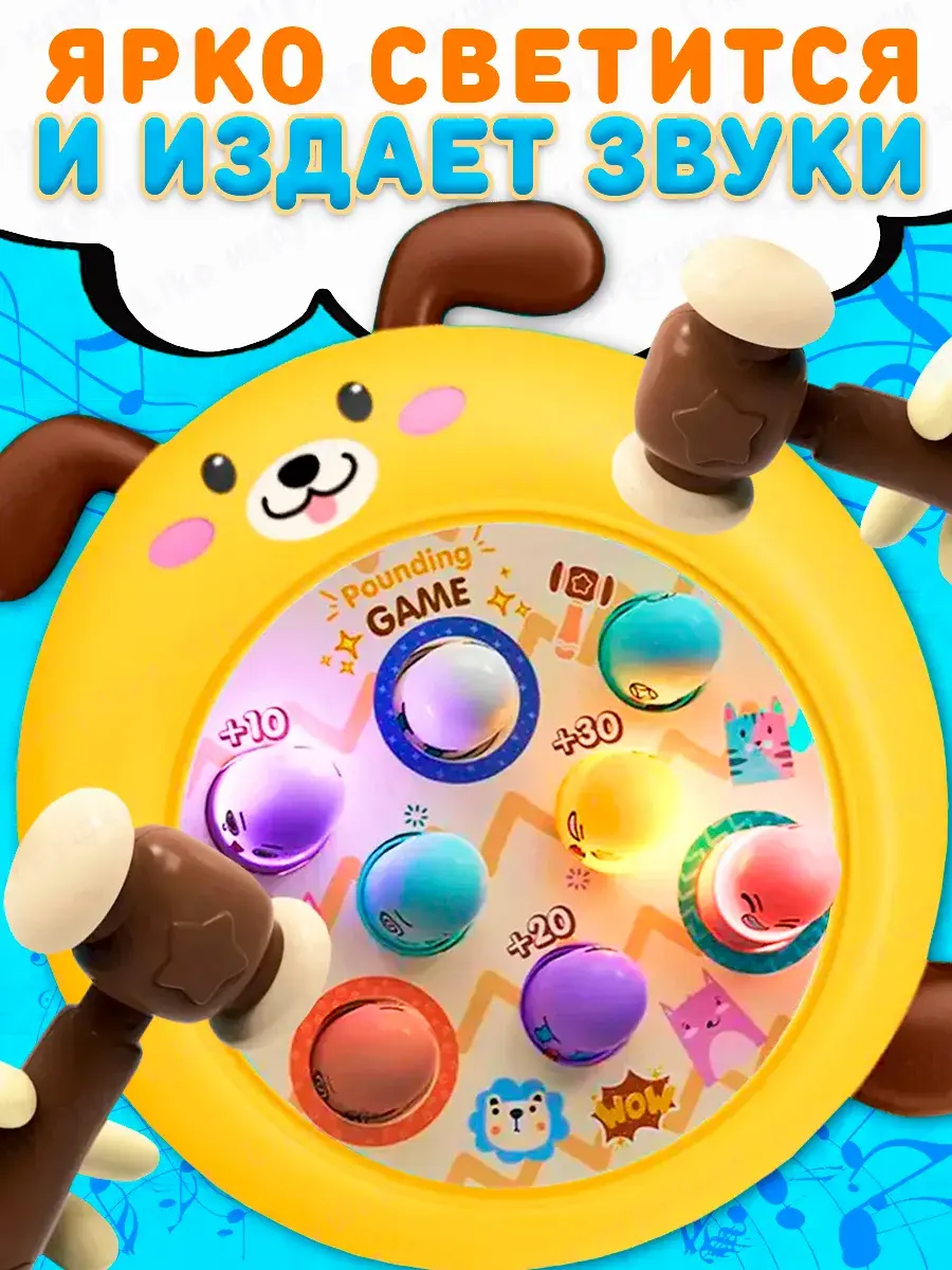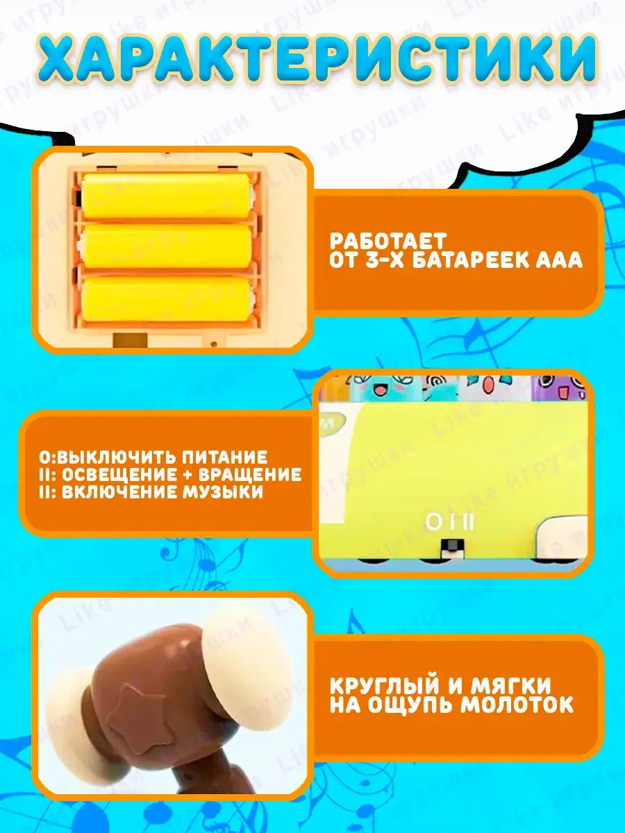 Молоточек удобно лежит в детской руке и обеспечивает комфортное использование. Игровой процесс способствует развитию моторики, ловкости и реакции малыша. Каждый удар по кнопкам дарит радость и помогает малышам учиться считать, различать цвета и формы.