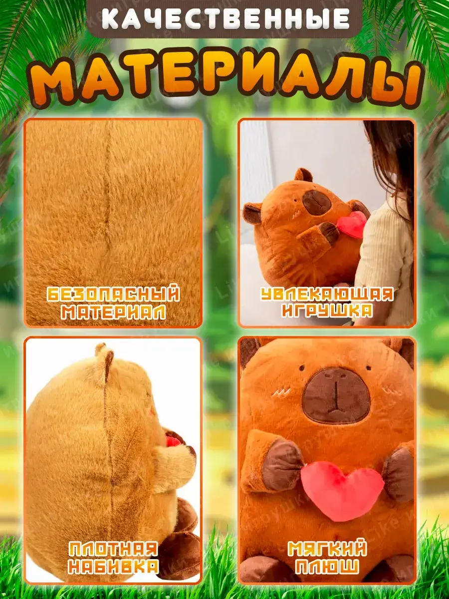 Идеальная игрушка для детей любых возрастов ждет вас! Не упустите возможность подарить вашему малышу лучшие моменты бесконечного счастья вместе с этой мягкой обнимашкой! Каждое взаимодействие сделает его день лучше и насыщеннее радостью общения с новым другом – подушкой капибара с сердечком!