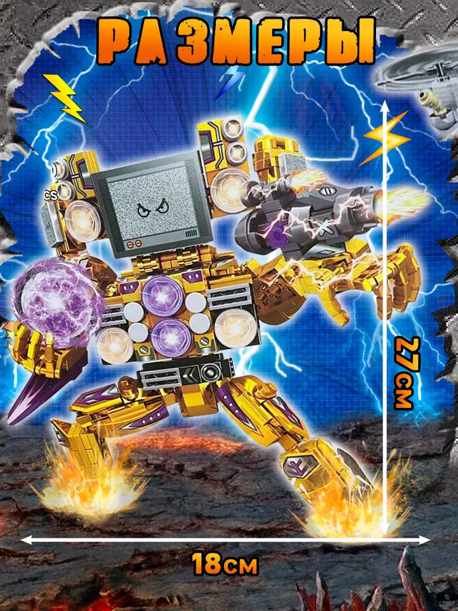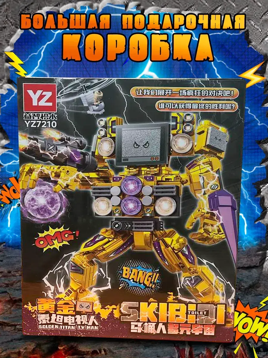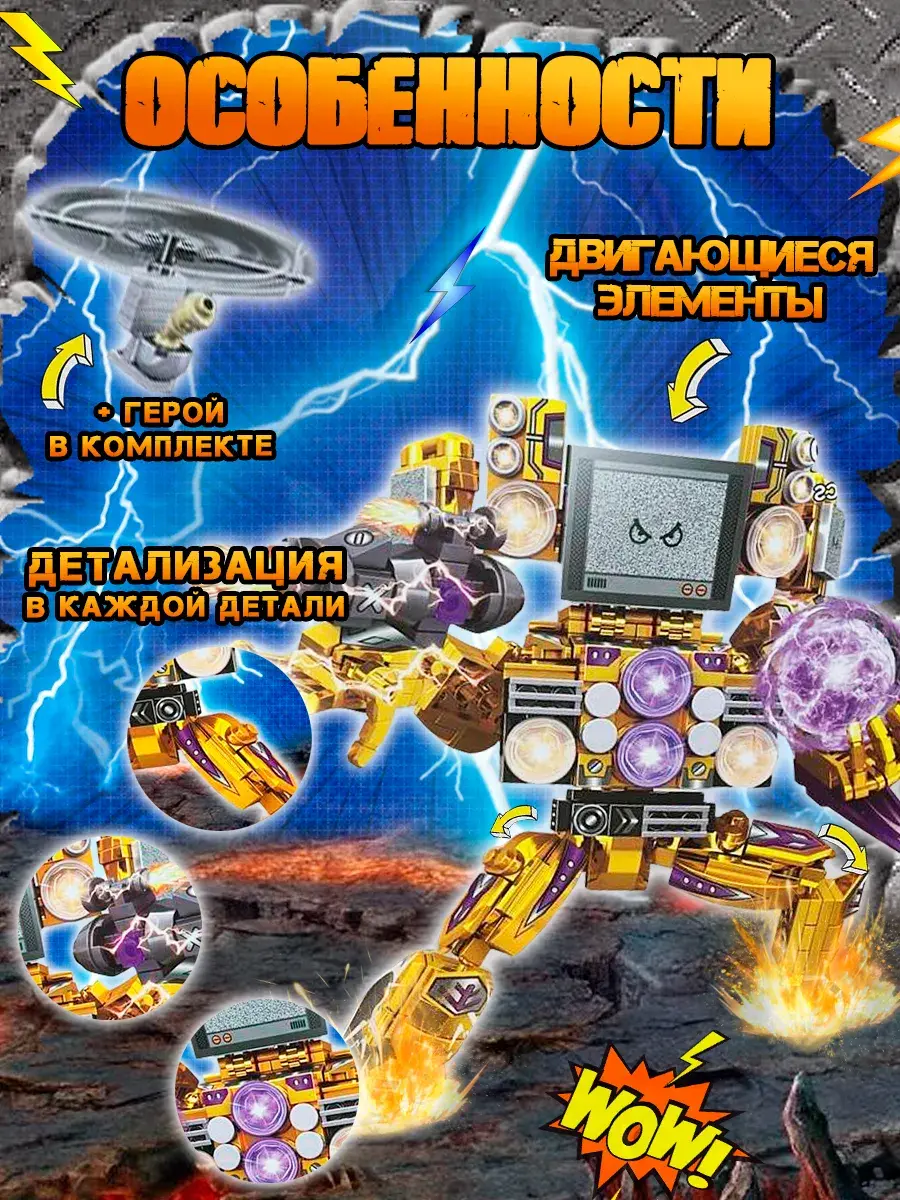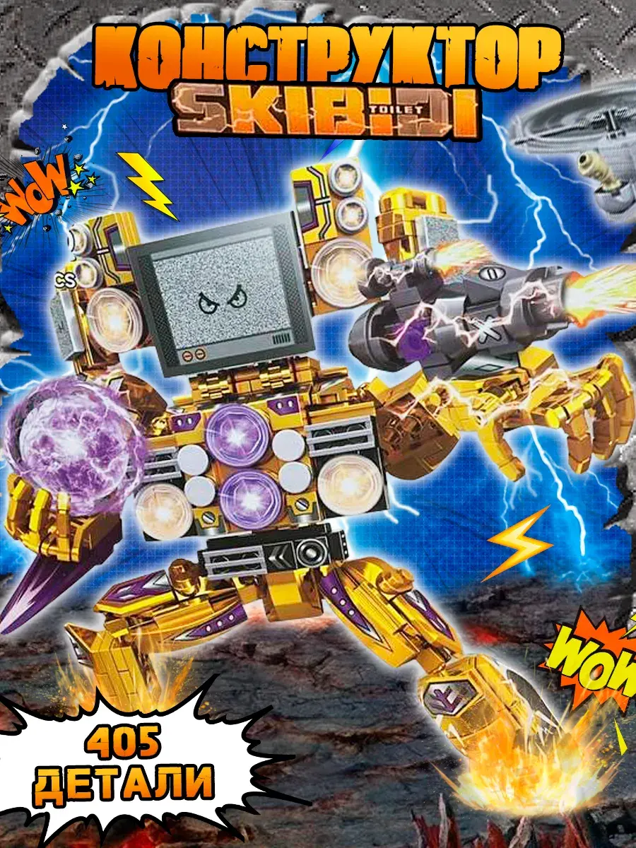 Этот детский конструктор порадует всех поклонников новых трендовых игрушек из Ютуба. Он включает в себя элементы, вдохновленные популярным мультсериалом. Мультсериал изображает войну между так называемыми Скибиди Туалетами — сущностями, представленными бестелесными головами внутри движущихся унитазов, и Героями — модифицированными людьми, головы которых заменены на камеры видеонаблюдения (Камерамен), колонки (Спикермен и Спикер вумен) и телевизоры (Твмен), Титан Клокмен ( Titan Clock men).