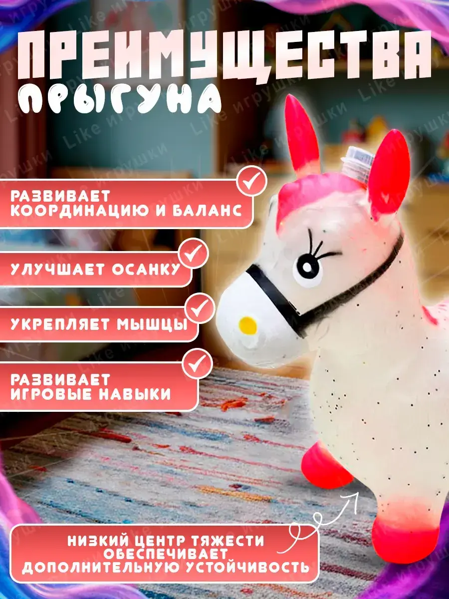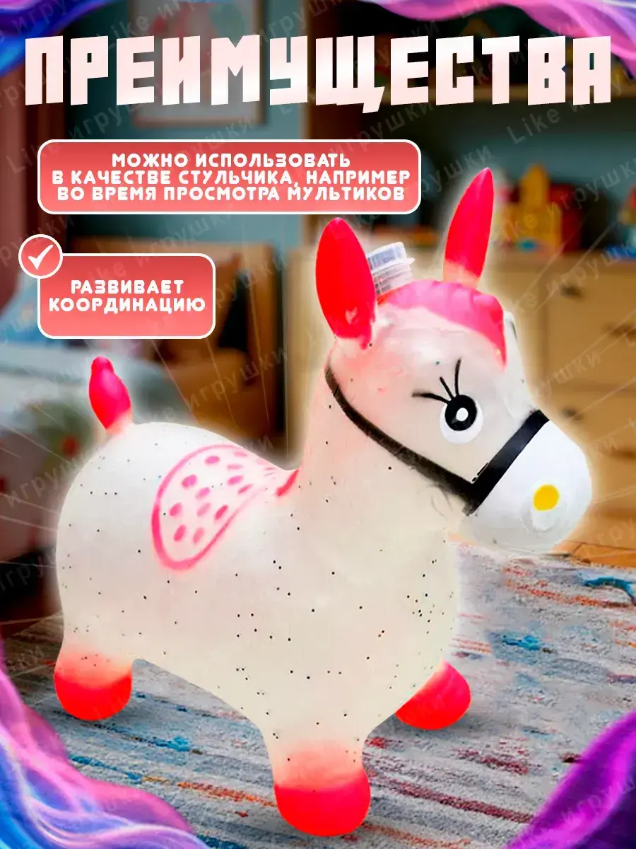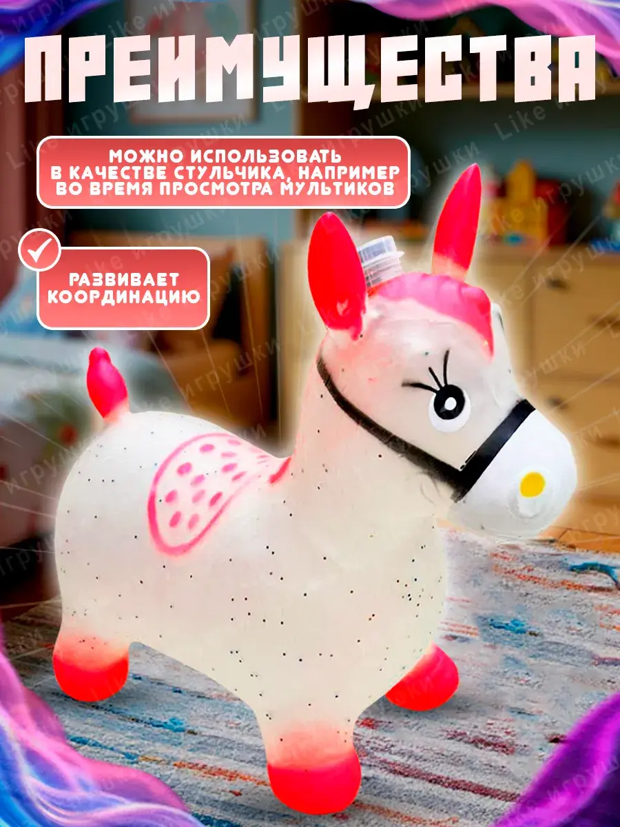 Эта детская игрушка прыгун отлично впишется в игры на улице или дома благодаря своему универсальному дизайну. Надувная лошадь станет не только другом для малыша, но и отличным тренажером для активного отдыха.