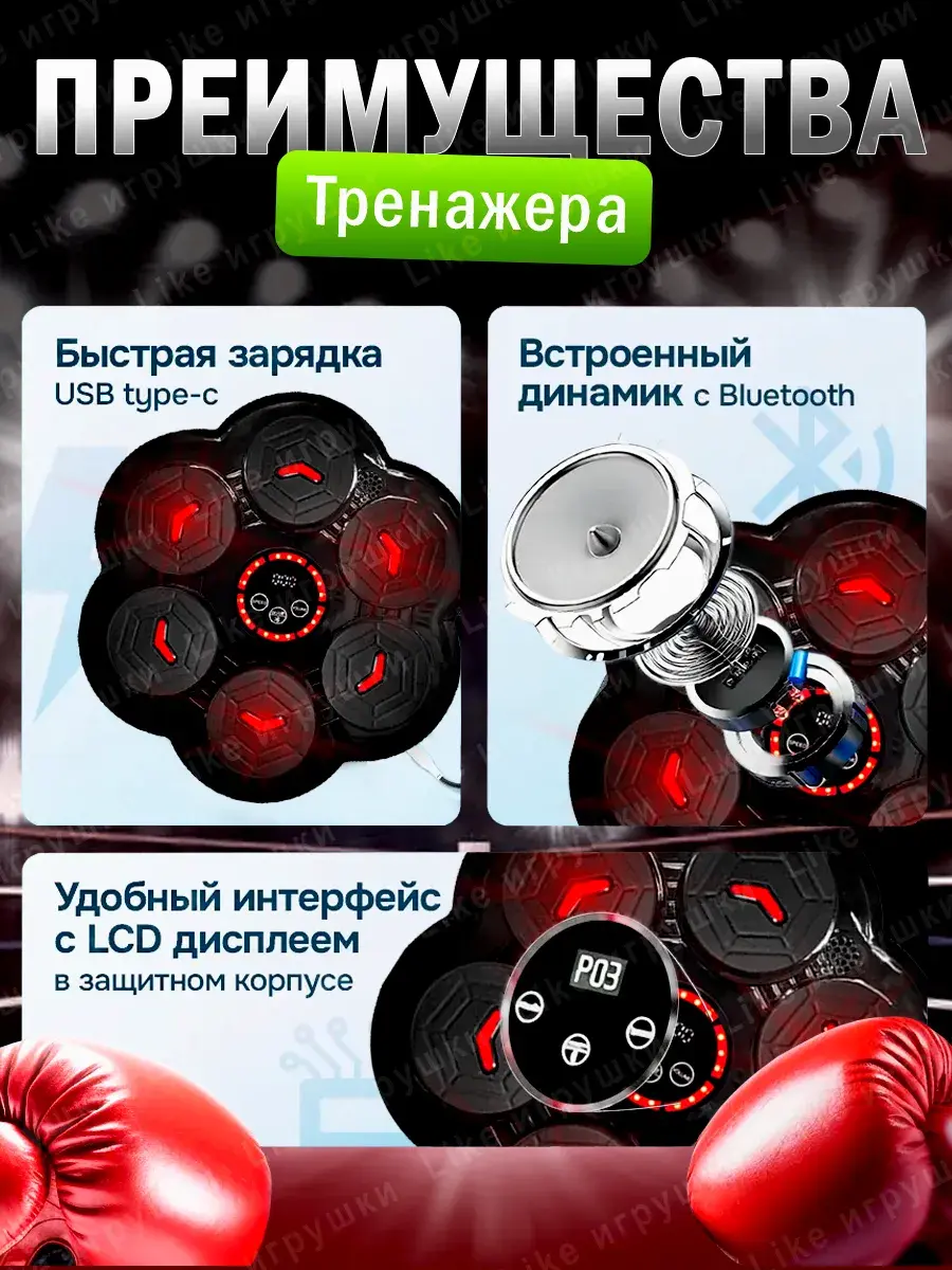 В комплект входят перчатки для бокса, что обеспечивает готовность к тренировке сразу после распаковки. Это удобно для мужчин, которые любят заниматься спортом без лишней подготовки. Элементы дизайна делают этот электронный тренажер стильным аксессуаром вашего домашнего инвентаря для фитнеса.