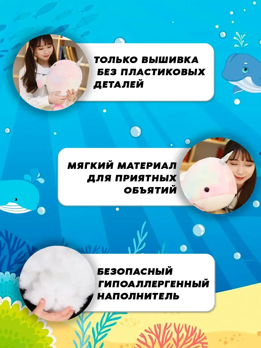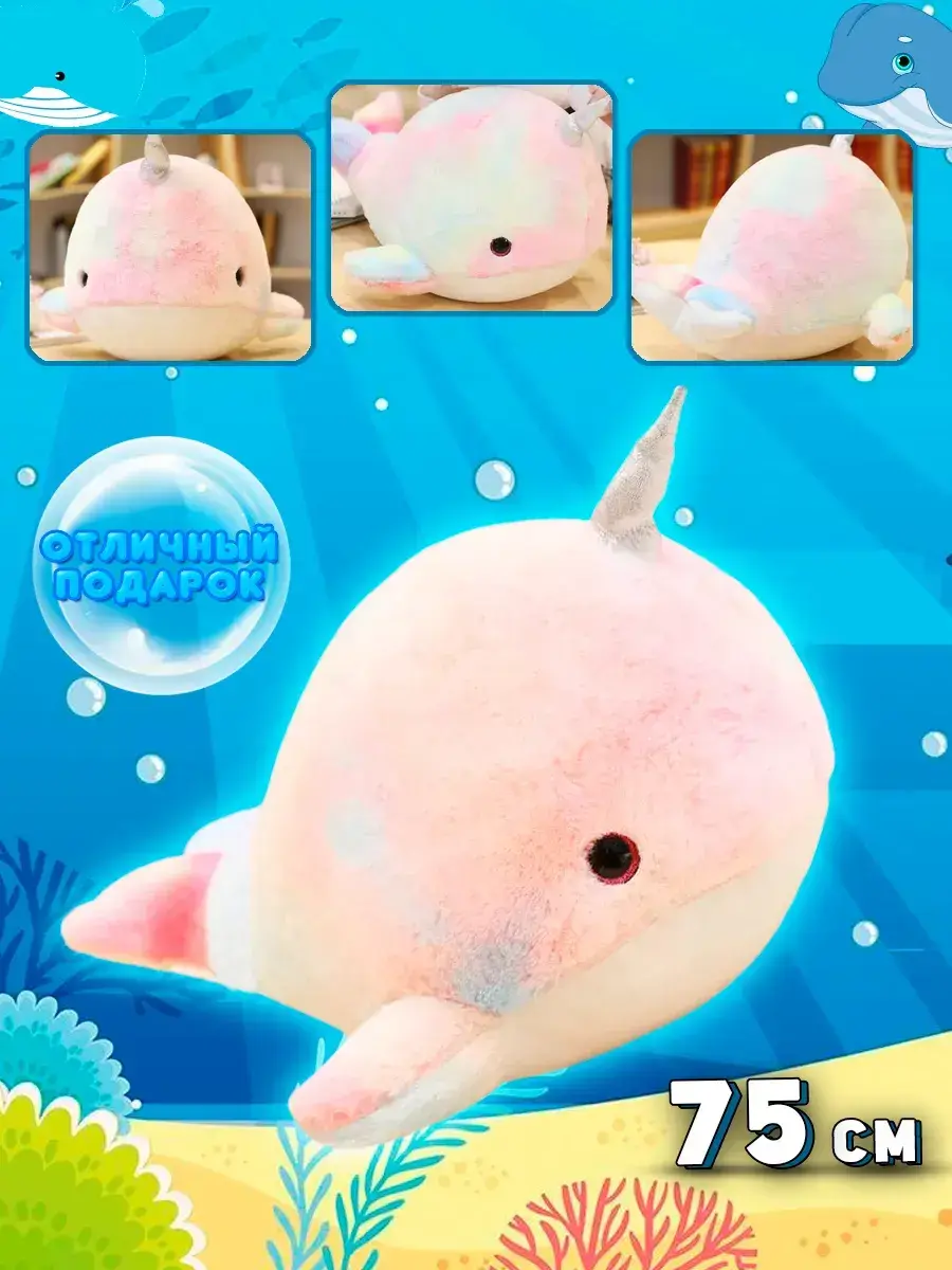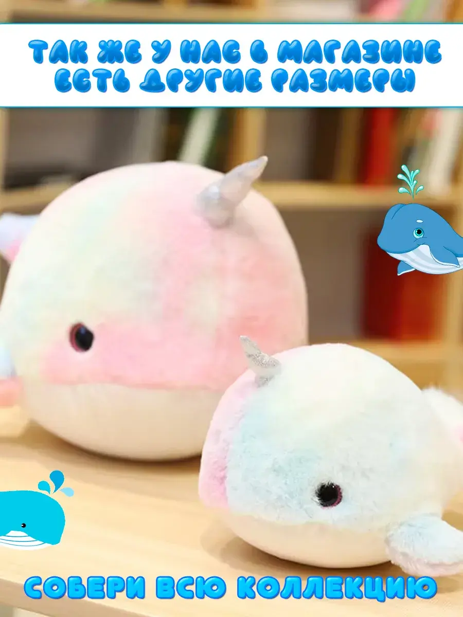 Милый кит с рогом единорога — это символ волшебства и счастья. Это будет неплохой выбор для девушек всех возрастов или как украшение детской комнаты. Большая игрушка может стать верным спутником для тех, кто ценит уют и нежность.