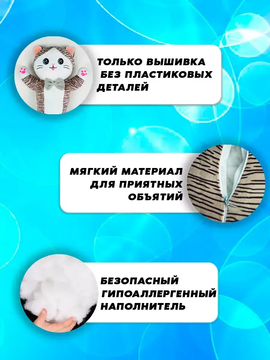 Этот мягкий котик станет отличным компаньоном как для игр, так и для сновидений. Его можно использовать в качестве подушки антистресс или антистрессовой игрушки. Большой серый плюшевый кот батон легко помещается в руках как взрослого, так и малыша.