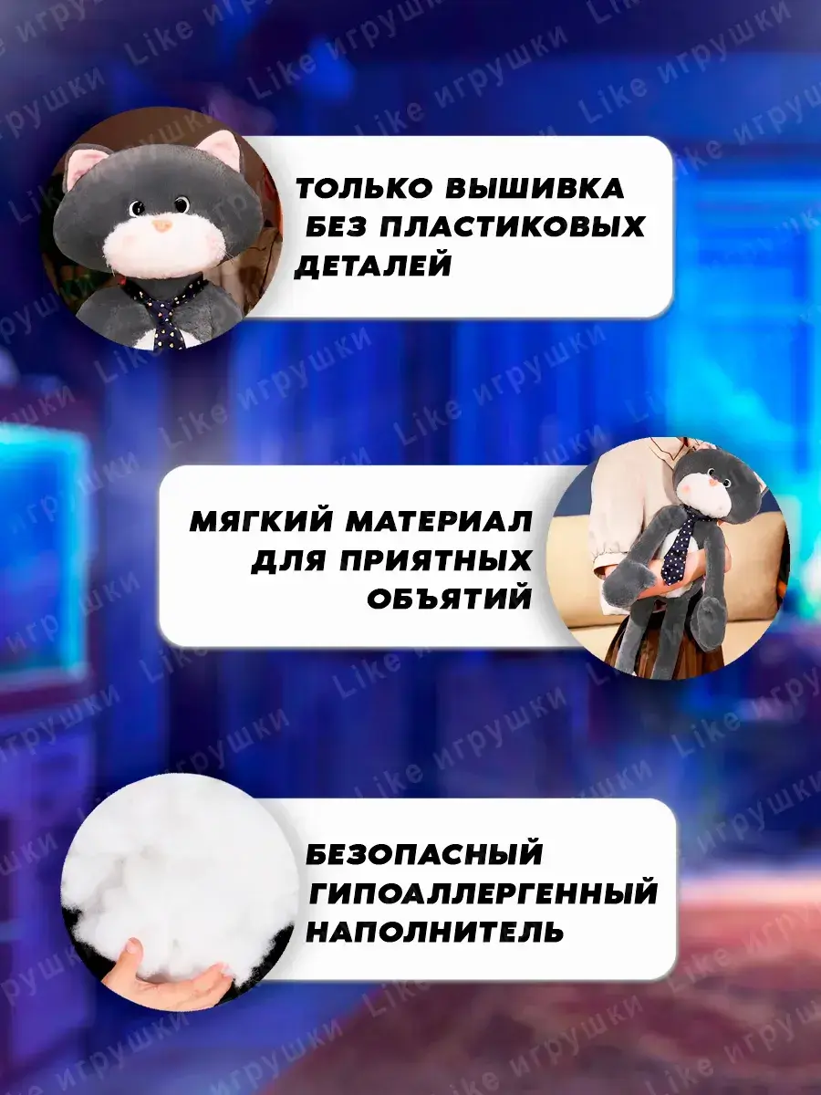 Мягкий котик с галстуком также отличается безопасным и гипоаллергенным наполнителем, который поддерживает здоровье детей и взрослых владельцев. Игрушки сертифицированы с учетом всех необходимых стандартов безопасности. Выбирая большого темно-серого кота Марса, можно быть уверенным в высоком качестве и экологичности изделия. Кошки мягкие остаются одной из самых популярных категорий среди подарочных изделий благодаря их универсальности.