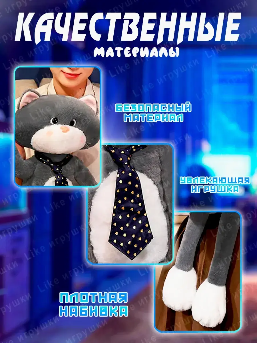 Кот в галстуке моментально привлекает внимание своим стильным аксессуаром. Этот плюшевый друг обладает длинными лапами, что делает его знакомство особенно увлекательным для самых маленьких поклонников игрушек. Графитовая игрушка выполнена из качественных материалов, что обеспечивает её долговечность и приятные тактильные ощущения при контакте. Котенок мягкая игрушка не только выглядит эффектно, но и становится многофункциональным элементом декора или надежным спутником в играх.