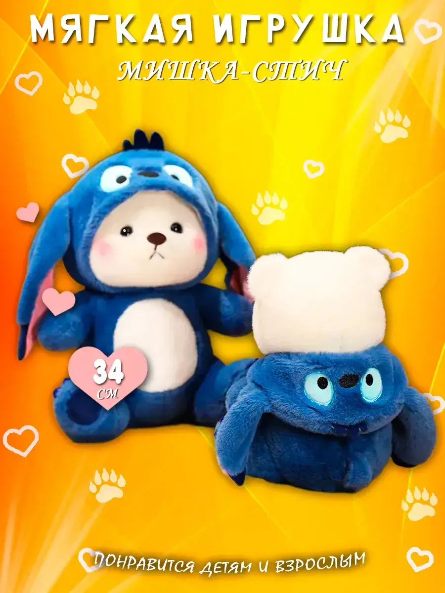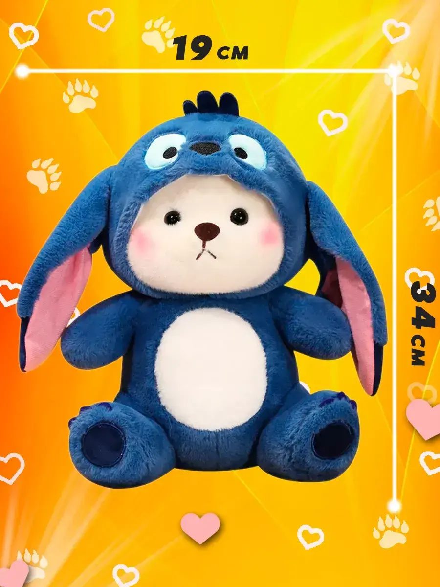 Плюшевый медведь в костюме Стич - это не просто игрушка, это настоящий антистресс. Капюшон сделает его еще более милым для девочек и мальчиков. Меховой плюш делает эту игрушку тактильно приятной на ощупь.