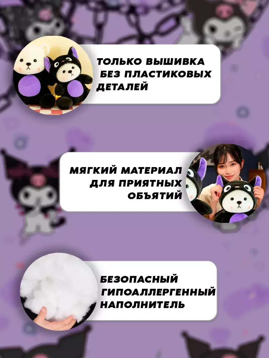 Этот мягкий мишка куроми Май Мелоди в одежде станет идеальным спутником для ваших детей и даже взрослых. Наша плюшевая игрушка kuromi выполнена из высококачественного материала, чтобы обеспечить максимум комфорта и мягкости при прикосновении. Он также является антистрессовой игрушкой, которая поможет расслабиться и снять напряжение. Его компактные размеры и легкость делают его отличным выбором для путешествий.