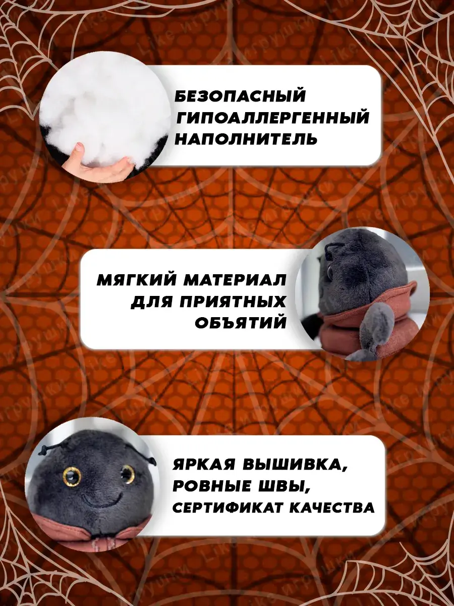Ее конструкция включает в себя множество деталей: текстурированные лапки и выразительные глазки, которые делают эту игрушку особенно привлекательной для детского восприятия. Мягкая поверхность паучка создает ощущение комфорта при обнимании, а также подходит для использования в качестве подушки или сплюшки.