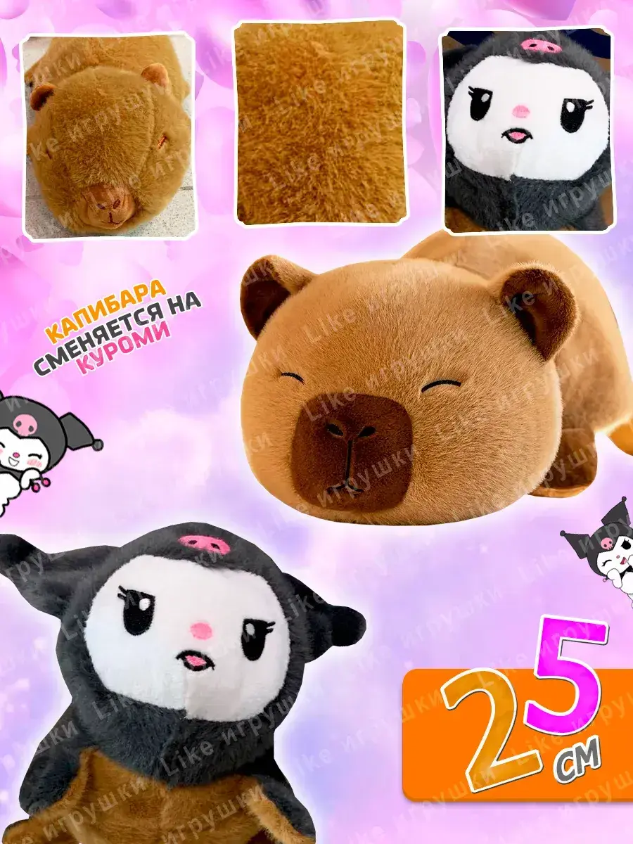 Мягкая игрушка вывернушка капибара куроми отлично подходит как подарок для малышей или детям постарше. Нежный цвет и приятная текстура делают её желанной частью любой коллекции интерьеров комнаты ребёнка. Трендовые игрушки 2 в 1 привлекают внимание своим дизайном и многофункциональностью.