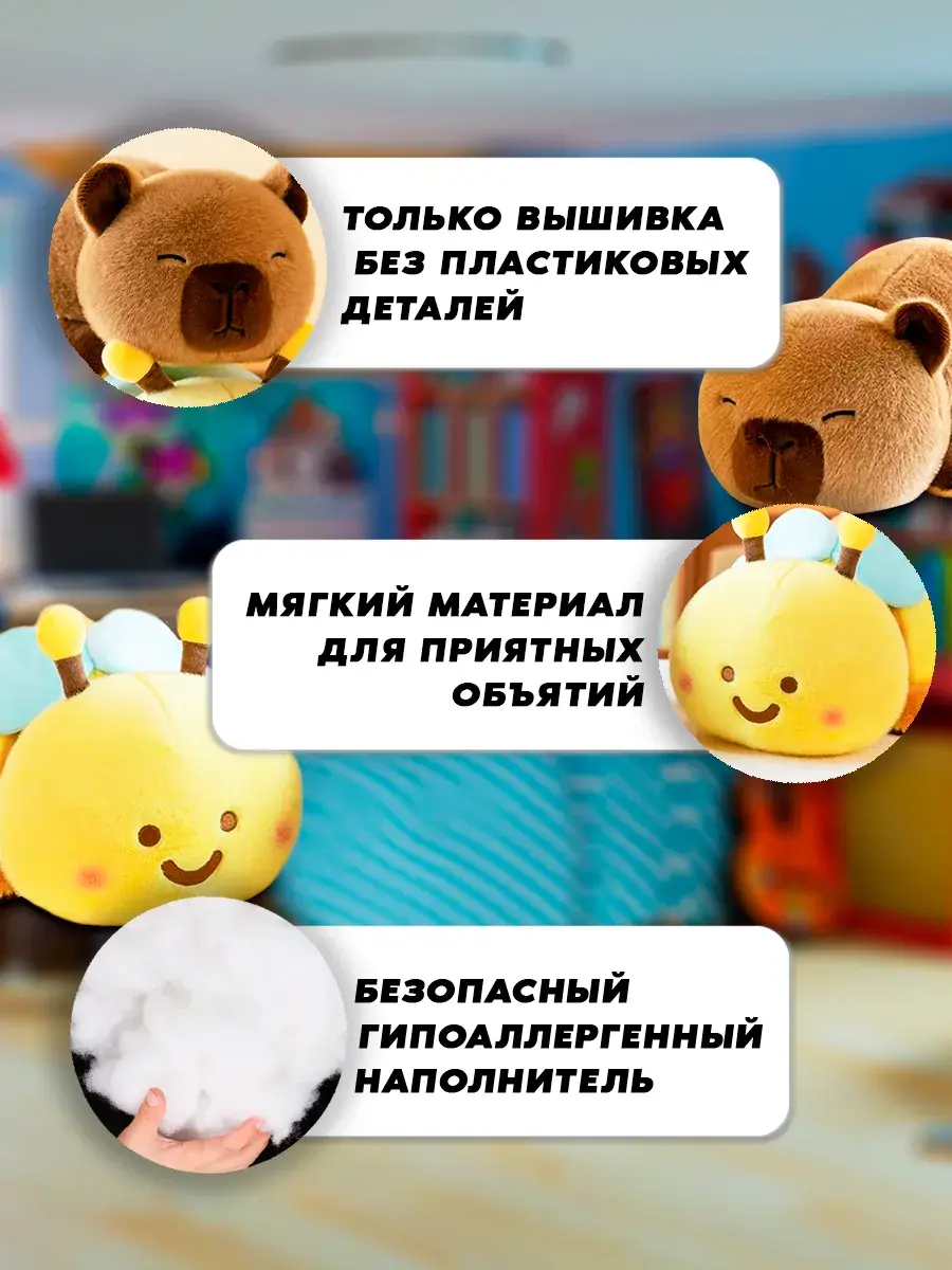 Мягкая игрушка вывернушка капибара пчёлка отлично подходит как подарок для малышей или детям постарше. Нежный цвет и приятная текстура делают её желанной частью любой коллекции интерьеров комнаты ребёнка. Трендовые игрушки 2 в 1 привлекают внимание своим дизайном и многофункциональностью.