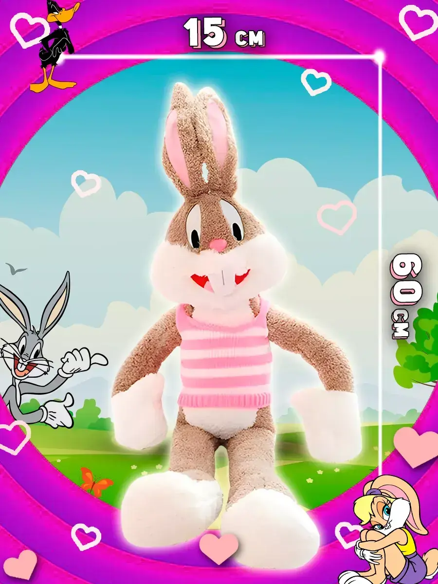 Мультяшные глазки и улыбка на лице создают неповторимый образ мультяшного зайца looney tunes. Мягкие игрушки для девочек всегда актуальны и любимы. Багс Банни, как и Лола Банни – один из самых популярных героев среди детей разных возрастов. Уникальный стиль и неповторимый шарм делают его привлекательным для всех поклонников мультфильма и можно.