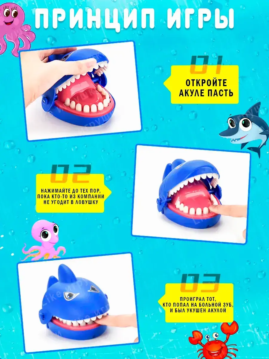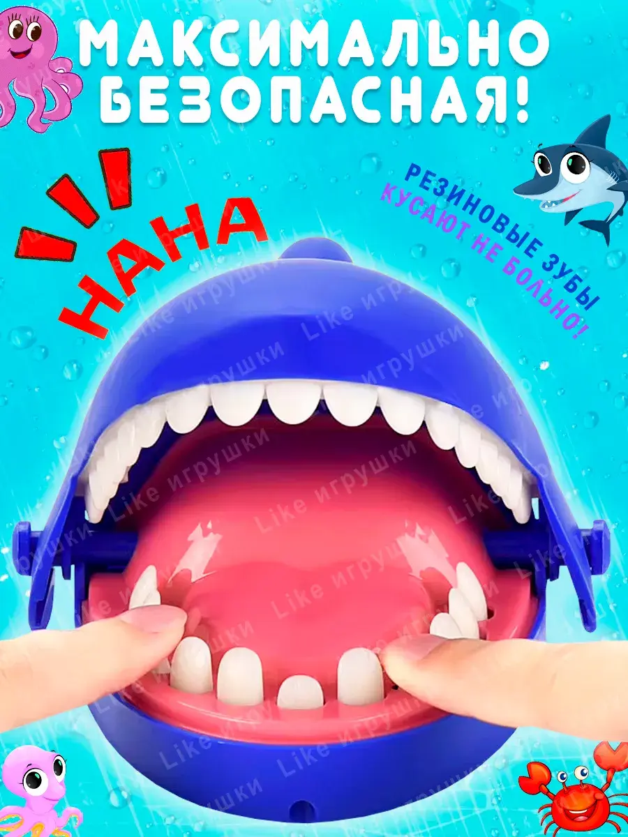 Зубастая акула игра— шикарная игрушка для развития внимания, концентрации и реакции ребенка, посредством веселой игры, в которую охотно вовлечет и взрослых. Укус акулы производится нажатием на зуб, зуб-активатор меняется рандомно, то есть предугадать какой зуб окажется роковым не удастся.