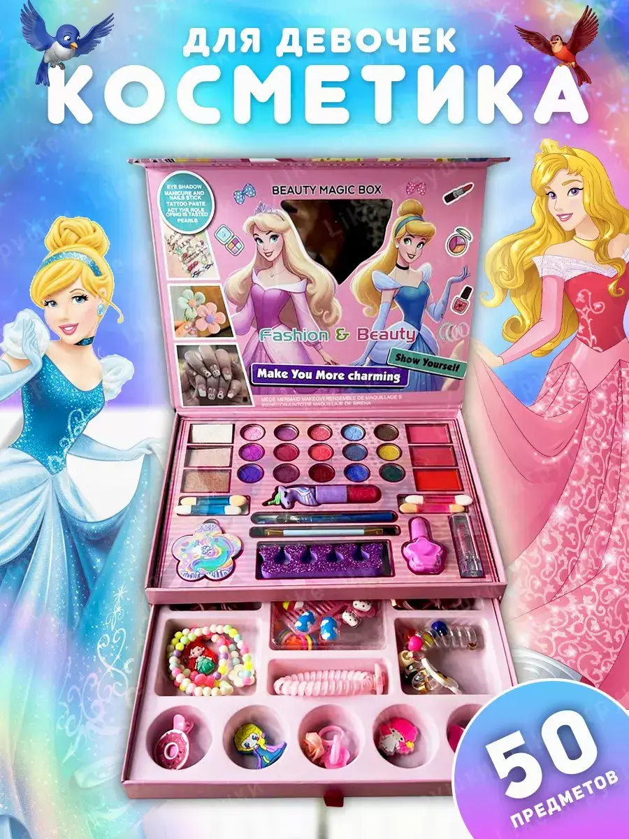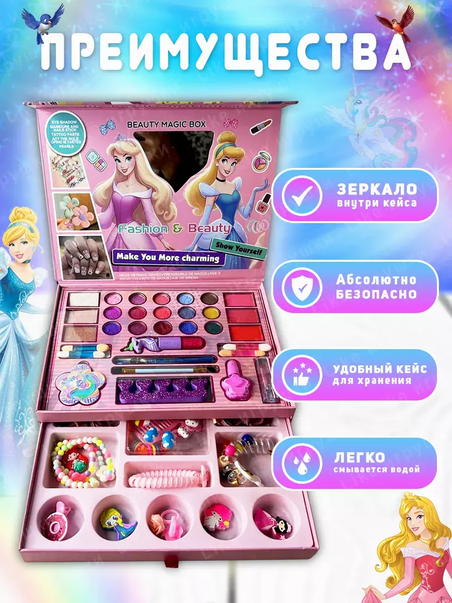 В этом чемодане с косметикой каждая деталь продумана до мелочей — дополнительные аксессуары всегда помогут завершить стильный образ вашей принцессы!