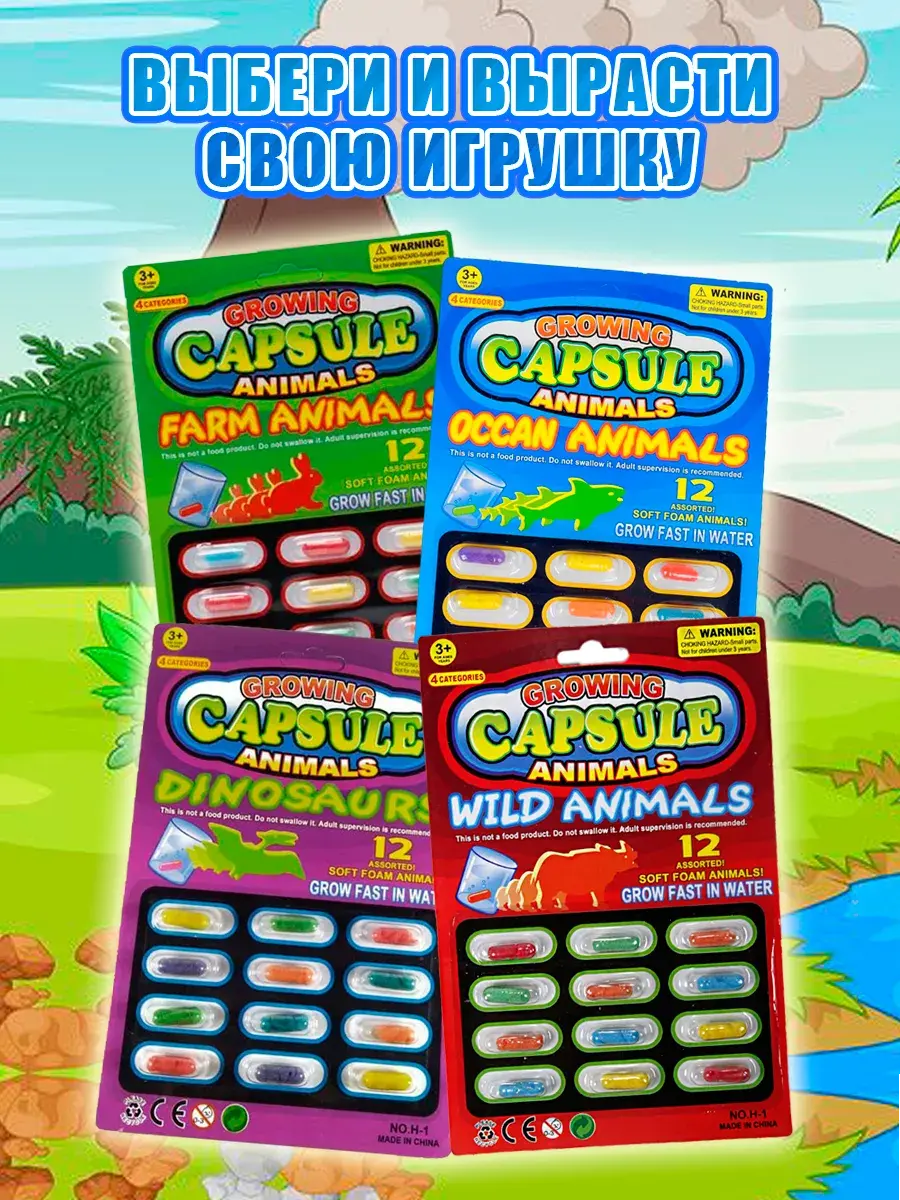 В комплекте: 12 ассортиментных растущих игрушке в яйце с заготовками. Размер капсулы 2х0,8 см. Маленькое чудо превращения прямо у Вас дома – осталось просто добавить воды, а набор растущих в воде игрушек все сделает сам.